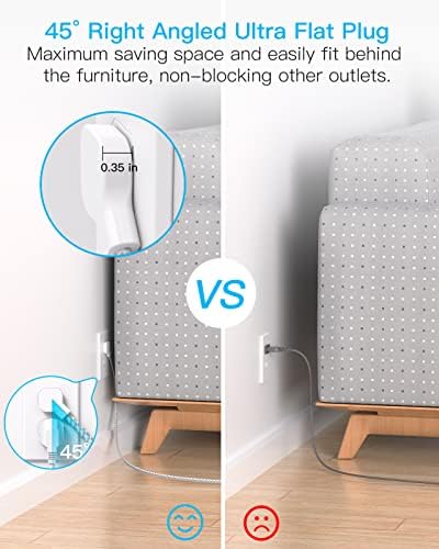 【Right Angle Ultra Flat Plug & 6 Ft Braided Extension Cord】 - With only 0.35 inch ultra thin plug and 45 degree right angle design, which is much slimmer than traditional plugs, can close to the wall easily and hide in the back of furniture, no waste for outlet and space. 3mm thicker extension cord is made of pure copper, which has better current carrying capacity (15A). The braided power cord is not easy to deform, durable and more safety.