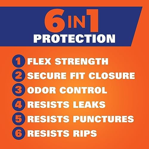 6-In-1 Protection-These Hefty 13 gallon trash bags offer a powerful combination of six features: flex strength, tough drawstring, patented odor control, and resistance to leaks, punctures, and rips