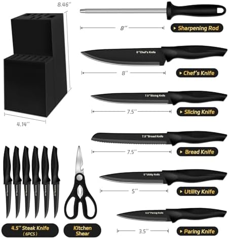 Knife Set with Block includes all of the most popular kitchen knives: 8“ Chef's Knife, 7.5” Bread Knife, 7.5“ Slicing Knife, 5” Utility Knife, 3.5” Paring Knife, as well as a six-piece set of Steak Knives, Kitchen Scissors, Knife Sharpening Steel, 14 Slotted Hardwood storage block (with non-slip feet).