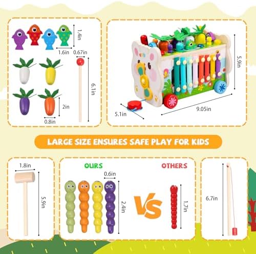 【9-in-1 Montessori Wooden Toy for 1 Year Old】This interactive pounding toy integrates gophers, xylophone,gears,carrot harvest and more.Montessori-inspired design helps toddlers 1-3 develop hand-eye coordination,music skills,and problem-solving through play