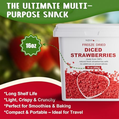 NUTRIENT-LOCKED CRUNCH: Hand-picked at peak ripeness, our strawberries pieces are freeze-dried using high-level technology to lock in nutrients, vibrant color, and natural aroma—every diced piece bursts with fresh strawberry essence in a crunchy