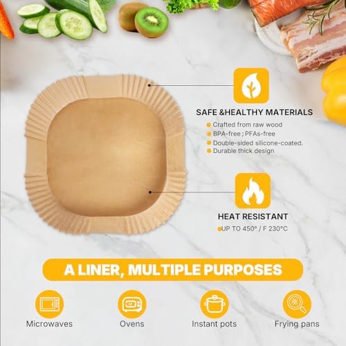 Premium Food-Grade Material – Safe & Reliable: Crafted from 100% natural, unbleached wood pulp with a food-grade silicone oil coating, these parchment paper liners are BPA-free, PFAS-free, and contain no fluorescent agents; They’re heat-resistant up to 428°F (220°C), making them safe for a wide range of cooking tasks including baking, air frying, roasting, and reheating
