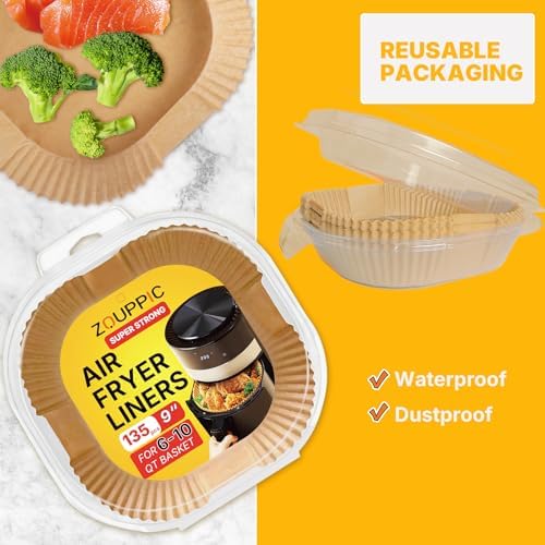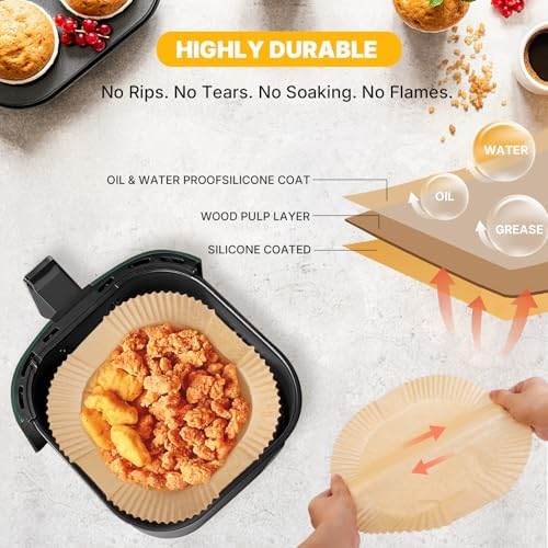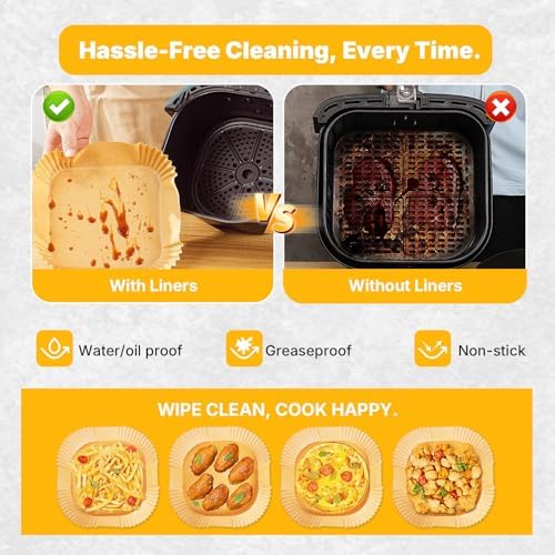 Non-Stick, Oil-Proof & Waterproof for Easy Cleanup: Say goodbye to scrubbing! These disposable air fryer paper liners feature a non-stick coating and leak-proof surface that catches grease, oil, and food residue; Keeps your air fryer basket clean and reduces mess, saving you time and extending the life of your appliance