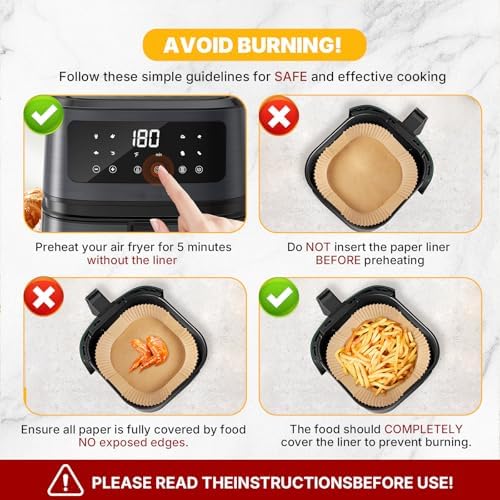 Designed for 6–10 QT Large Air Fryers: Each parchment paper liner measures 9 inches wide and 1;8 inches high, specially made for 6 to 10 QT airfryer baskets; The square, bowl-style design prevents food from sticking to the sides of the basket and ensures full coverage for bigger portions—great for family-sized meals or party snacks