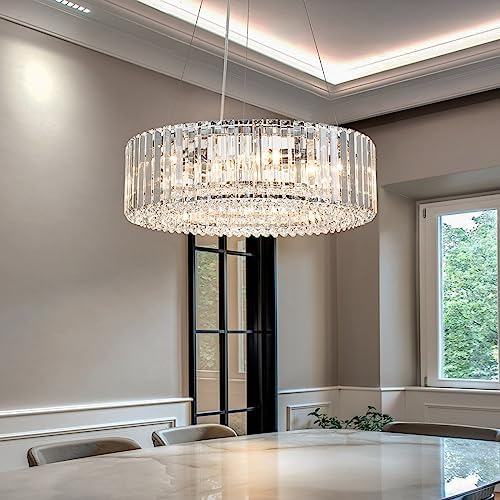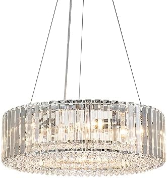 SPECIFICATIONS - The main body of this elegant crystal ceiling chandelier has an outer diameter of 19.69in (50cm), an inner diameter of 12.6in (32cm) and a height of 6.3in (16cm). Transparent suspension cord is 59in,which is adjustable and minimum length to 11.8in. Crystal string: 186pcs. Surrounding triangle crystal piece 0.87*5.91in(2.2*15cm): 97pcs.