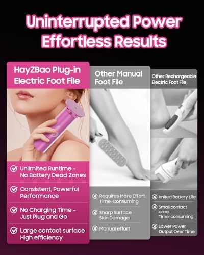 Adapter-Powered Design: No Batteries Required,Plug into an outlet for immediate use.Unlike cordless or rechargeable foot file, this type requires a constant power supply, making it suitable for extended usage without worrying about battery life