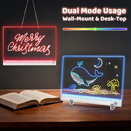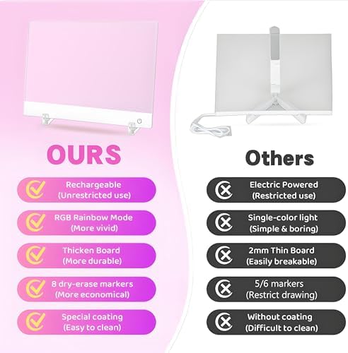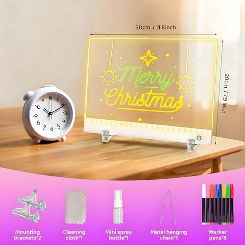Upgraded Acrylic White Board: This illuminated acrylic dry erase board features high-quality water-soluble dry erase markers for effortless erasing. Surface treated with scratch-resistant coating to prevent damage during wiping, effectively extending product lifespan. The perfect 11.8*7.9inch size provides ample space for creativity. Equipped with 23 LED lights for enhanced brightness, richer colors, and superior lighting effects.