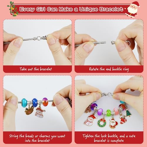 PREMIUM MATERIAL - Christmas charm beads and pendant are well made of non-toxic plastic and environmental alloy, resistant, not easy to fade, The length of the bracelet is 6.3”, ideal for girls arms, The bracelet chain features a barrel charm clasp and innovative threading system, easy to create your own bracelets and change every time you want