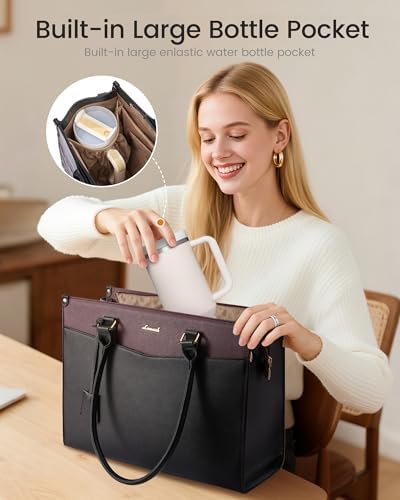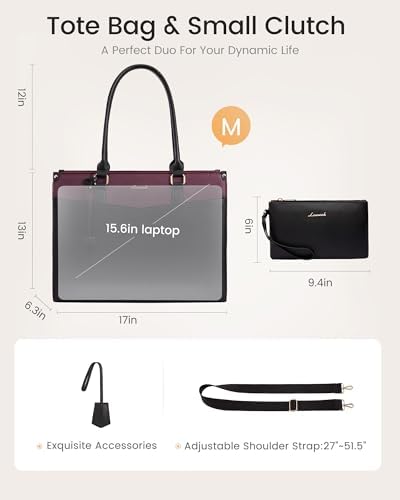 【2-in-1 Laptop Tote Bag & Large Capacity】This versatile Lovevook laptop bag for women comes with a removable clutch, giving you two stylish women work bags in one. Its spacious interior (17"L x 13"H x 6.3"W) features a dedicated padded compartment to securely fit laptops and tablets up to 15.6 inches, plus additional pockets to keep all your essentials—like your phone, documents, water bottle, and even cosmetics in the clutch—neatly organized.