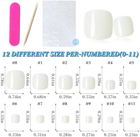 Acrylic nails press on toenails pack: Fake toe nail press ons set, including 120pc 12 sizes toe nail tips, 5 sheets adhesive tabs, 1pcs nail file and 1pc nail stick. Toenail press ons sets includes 120pc press on nails short length and all essential tools to manicure, big quantity toe press on nails square shape with multiple sizes which can fit kids, girls women, teens, prefect DIY short fake toe nails press on set for you enjoy manicure time with your family and friends together!
