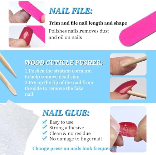Reusable Press on Nails with Useful Tools: This natural press on nails for girls has 5 sheets nail adhesive tabs which has strong adhesive, clean, and no residue. You want change the short press on nails look frequently and don't hurt your toenail, sticky tabs is your best choice. Bulk press on nails pack with self-handle natural nails can easily apply on feet, perfect for self manicure at home. Fake nails with glue tabs apply easily even for beginners and false nails can lasting long time.