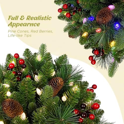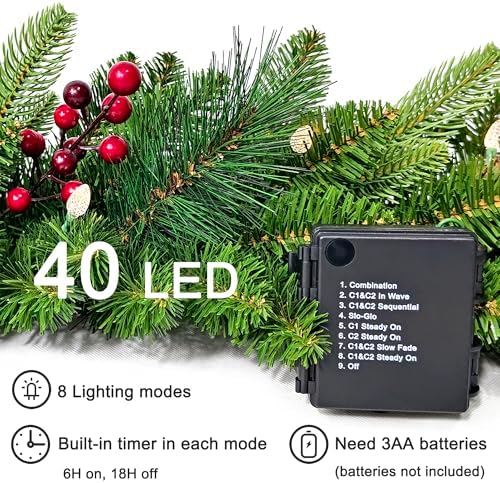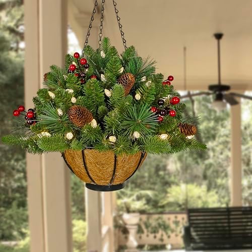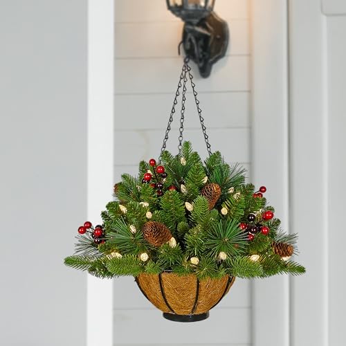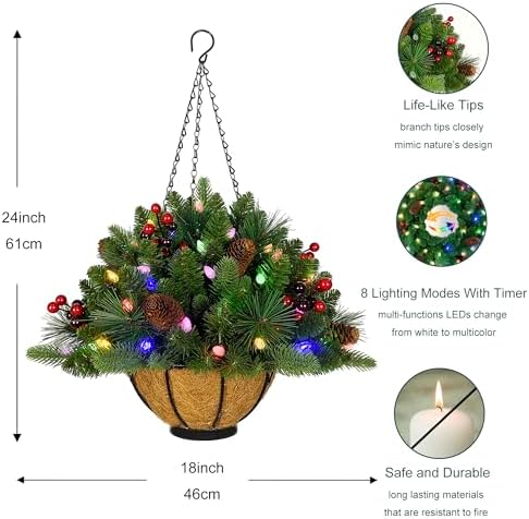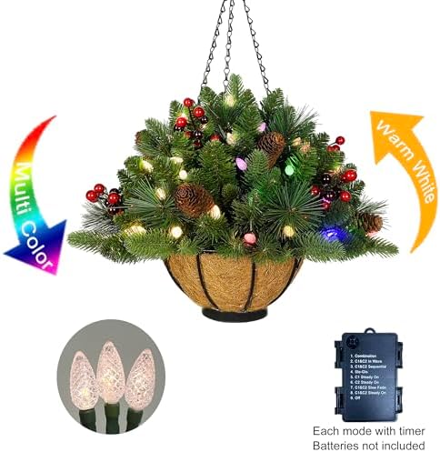 Welcoming Festive Atmosphere: The Assilyraft 18-Inch Artificial Christmas Hanging Basket brings a cozy holiday vibe to your home. Its exquisite design combined with red berries, pine cones, and 40 dual-color 3AA battery-operated C3 LED lights(batteries not included) will infuse your space with joyful Christmas decor.