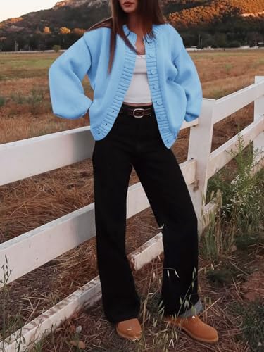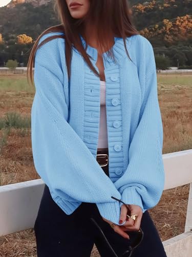 Feature: Womens fall knit cardigan features long lantern sleeve, crew neck, drop shoulder, button down, classic solid color, ribbed knit, casual loose fit. Fall cardigans for women 2025, sweater jacket for women, crew neck cardigan sweater for women.