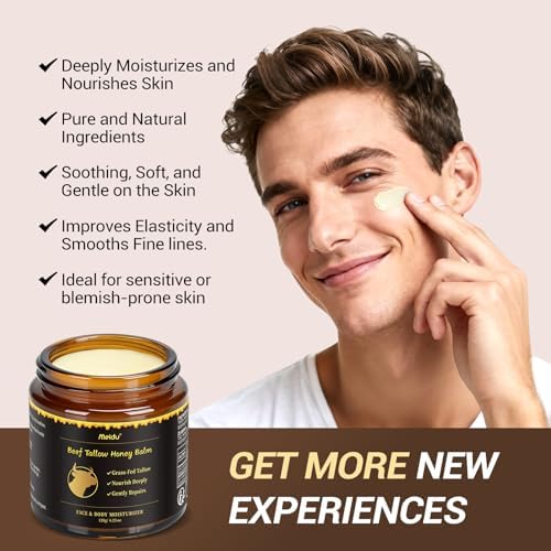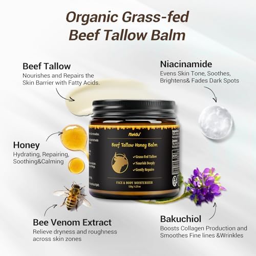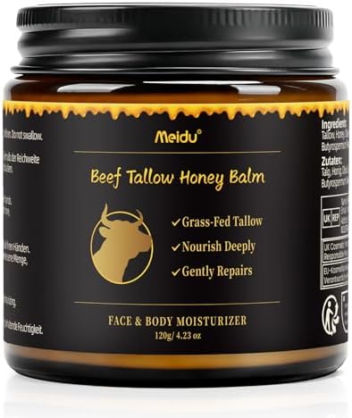 100% Grass-Fed Beef Tallow Moisturizer - Experience the luxurious blend of organic grass-fed beef tallow, raw wild honey, and beeswax for deep hydration and nourishment. Natural honey and tallow aroma, no strong irritating flavour.