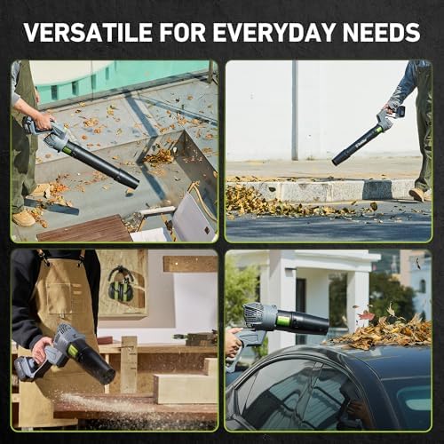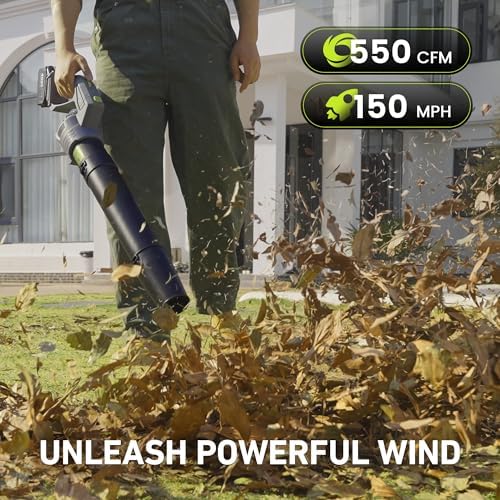 Powerful Airflow for Maximum Efficiency: This battery leaf blower delivers up to 550 CFM of airflow and wind speeds of 150 MPH, providing the power you need for quick and efficient cleanup. Whether you're tackling wet leaves, grass clippings, dust, or sawdust, the high-powered airflow ensures that debris is cleared with ease. Its strong performance helps you maintain a clean yard, porch, or workspace faster, helping you maintain clean and tidy outdoor spaces without taking too much time