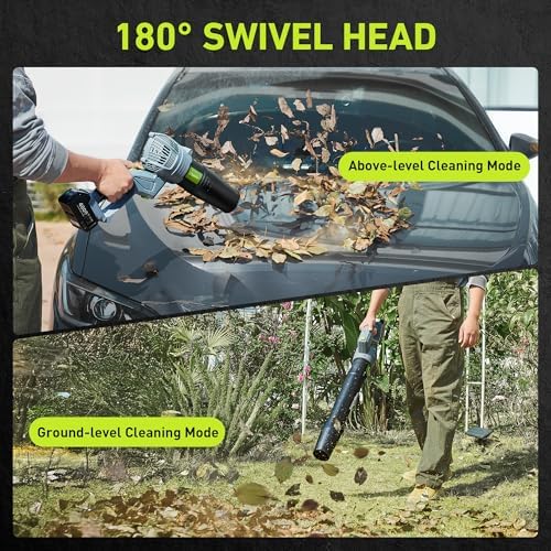 2 Working Modes for Enhanced Versatility: Featuring a unique 180-degree swivel head, this cordless leaf blower allows you to effortlessly switch between two modesfor both ground-level and above-ground cleaning tasks. Tackle porches, walkways, and even automobile surfaces or roof edges with ease, all while reducing strain on your back and shoulders