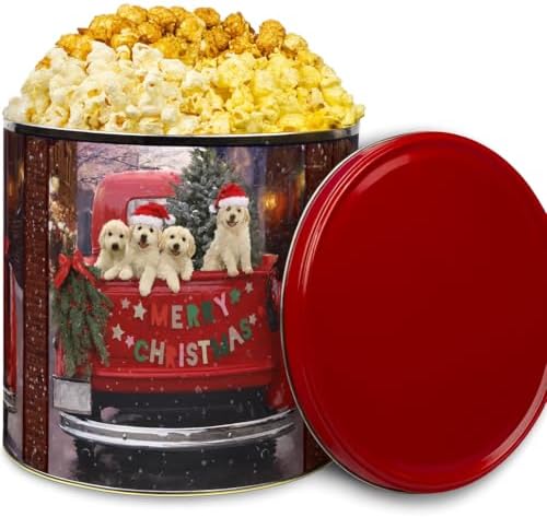 GiftPop Popcorn Tin with Labrador Puppies sitting in the back of a classic vintage red truck alongside their Christmas tree. A cute swag Merry Christmas sign adorns the tailgate!