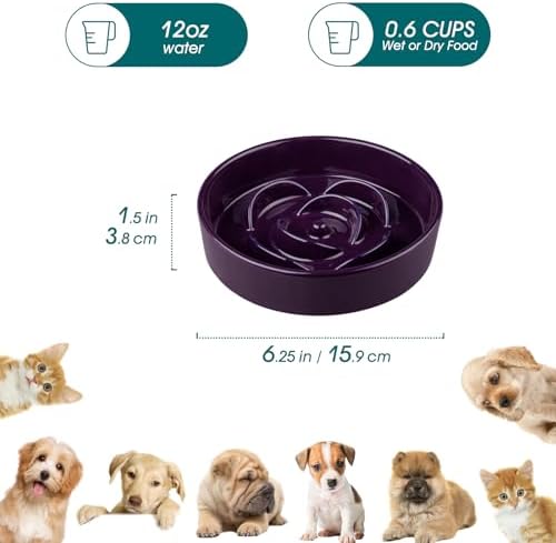 Which Breeds are Suitable: This ceramic slow feeder dog bowl is perfect for small pets like cats and small dogs, including Chihuahuas, Pomeranians, Maltese, Teddy Bears, Shih Tzus, and Pugs. With a 6.25-inch diameter, it holds 0.6 cups of dry food or 12oz of water, featuring slow-feeding ridges to promote healthier eating habits. Made of durable, pet-safe ceramic, it’s ideal for portion control and preventing bloating in tiny breeds.