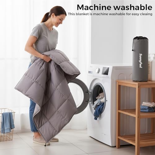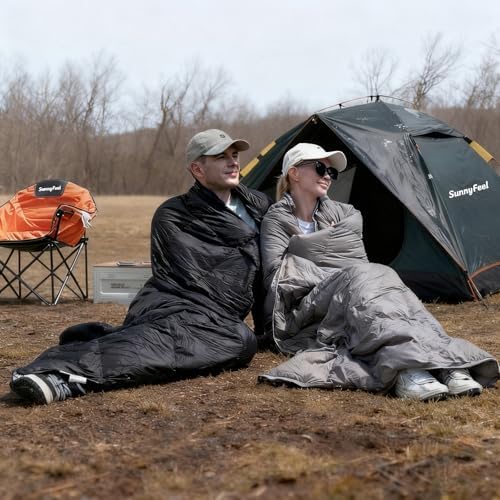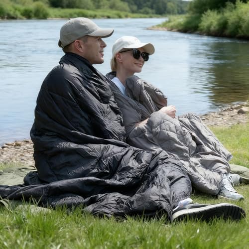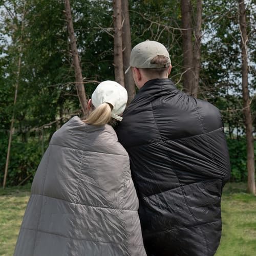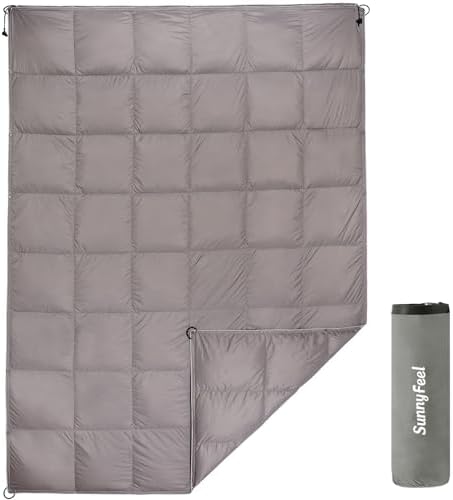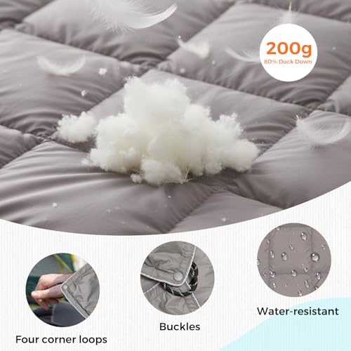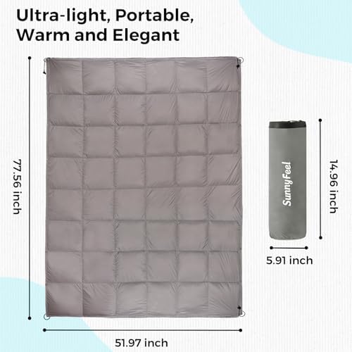 【Puffy and Warm】Made with 20D double-sided tear-resistant nylon, this waterproof fabric features a solid color design for a subtle yet luxurious look. Filled with 200g of 80% white duck down, ensuring even distribution without any leakage, significantly exceeding the common 180g filling in the market. The camping blanket keeps out the cold air outside.