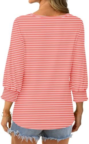 3/4 Sleeve Smocked Cuffs Blouse: Womens shirts designed with smocked cuffs, 3/4 sleeve, loose fit dressy casual, work shirts, casual outfits makes you look more chic, stylish