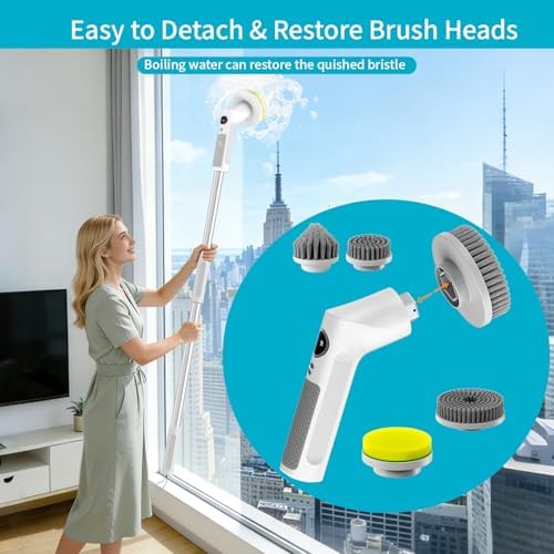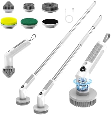 【6-in-1 Versatility – Save Time & Effort】The Bathtub Floor Scrubber comes with 6 replaceable heads (big flat/small flat/pointed/sponge/cloth/velcro pad) that can be removed separately for cleaning. It is widely used for bathrooms, bathtubs, grills, walls, windows, dishes, sinks, corners, gaps, floors, glass, tiles, car wheels, interiors, kitchens, furniture, and stoves.