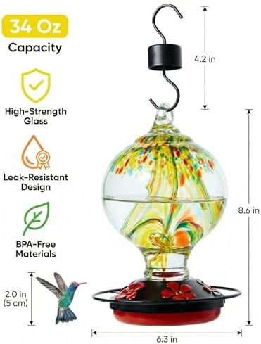 【More Visits, Fewer Refills】 Holds 34 oz of nectar to keep hummingbirds coming back with fewer refills. Made for outdoor hanging on patios, porches, and yards—includes a hanging hook for quick setup.