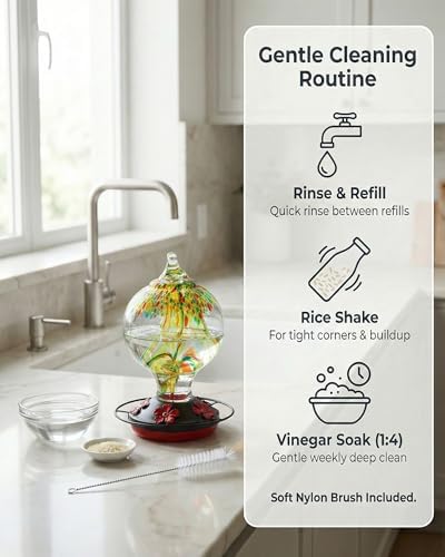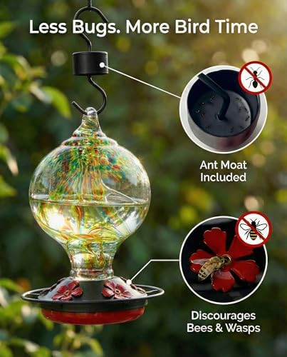 【Attracts Hummingbirds, Not Bugs】 Bright, decorative glass helps draw hummingbirds in, while the ant moat helps block ants and bee-resistant ports are designed to discourage bees & wasps—so your nectar is for hummingbirds, not pests.
