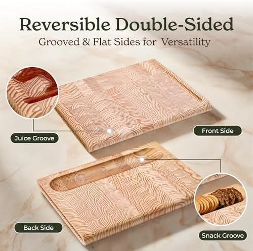 【Extra Large, Designed for Perfect Cutting】Cut it, prepare it, serve it! Extra large Cutting Board for kitchen measures 17 x 12 x 1.2 inches, used for everything from cutting and chopping to carving and serving. Perfect for BBQ masters and all cooking enthusiasts. Thoughtfully designed with recessed grips for easy handling, each board is reversible, Use the grooved side to collect juices and crumbs as you cut, or flip the board over to serve cheese, charcuterie or appetizers, perfect complement to any kitchen