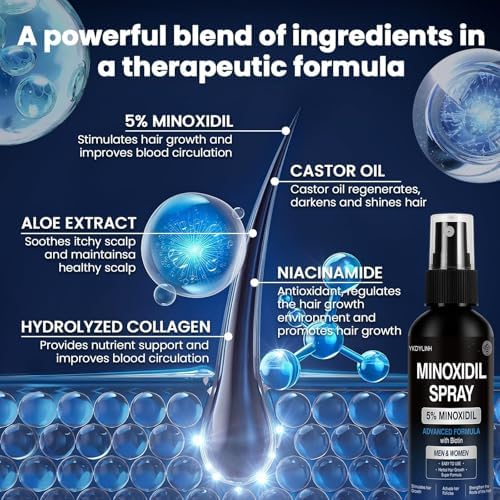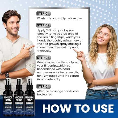 Hair Regrowth Treatment: Minoxidil Spray is designed for ease of use and is ideal for both men and women. For best results, use twice a day, morning and evening. Simply spray the hair growth spray directly onto the scalp in the area of hair loss massaging it in for absorptionhair growth spray