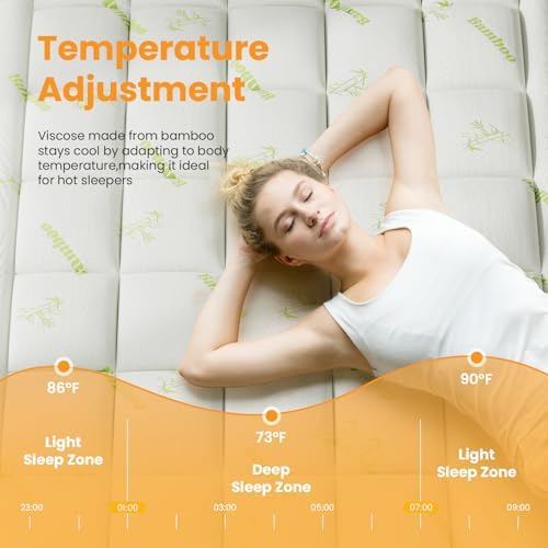 【Cool & Breathable for Restful Sleep】 Crafted from premium 40% bamboo viscose material and 60% polyester, ideal for sensitive sleepers.This bed cooling system wicks away heat and moisture throughout the night, ensuring a consistently cool and dry surface. Say goodbye to night sweats and hello to deep, restful sleep on our bamboo mattress topper.