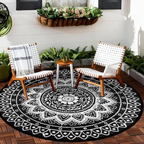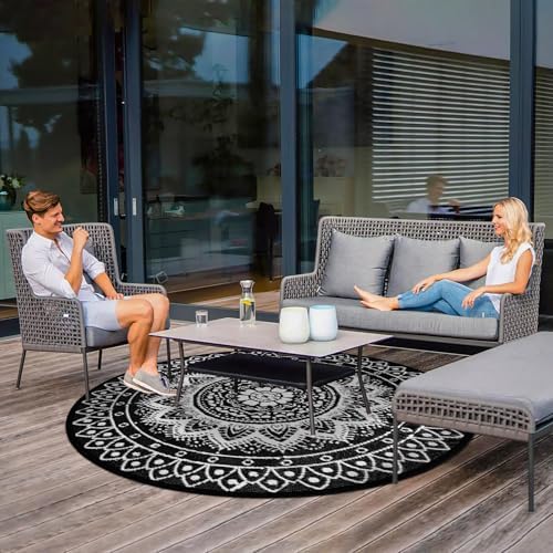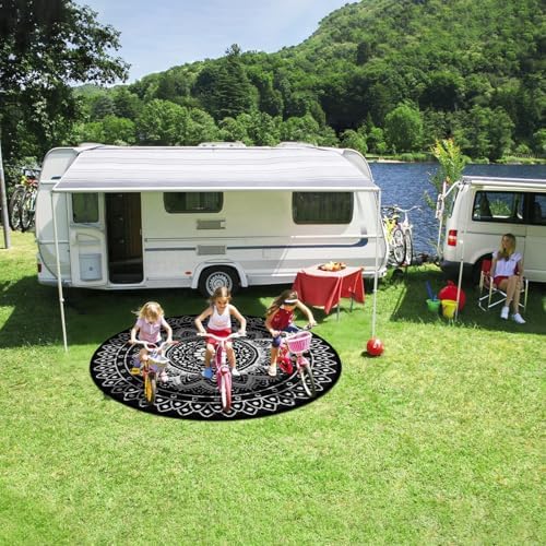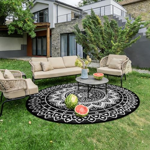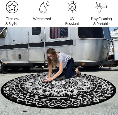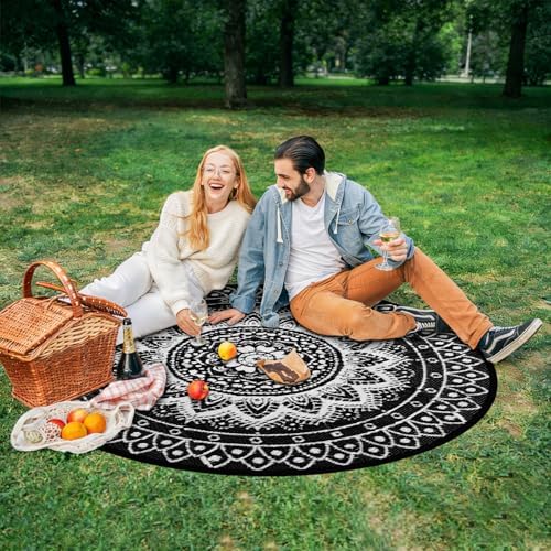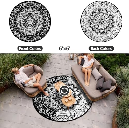 [Multi-scenario Adaptable Round Outdoor Rug]: The round outdoor rugs for patios are made of tough material, with a precision weaving process that is sturdy and durable, adapted to a wide range of scenarios such as decks, patios, balconies, decks, RVs, lawns, beaches, etc., and can be used as a casual sitting rug, decorative rugs and more. Whether it is outdoor barbecue, small gathering of friends, parent-child games, or beach picnic, RV camping, can provide soft and comfortable rest space. At the same time both color and practicality, it is an ideal choice as a gift for friends and relatives and outdoor enthusiasts.