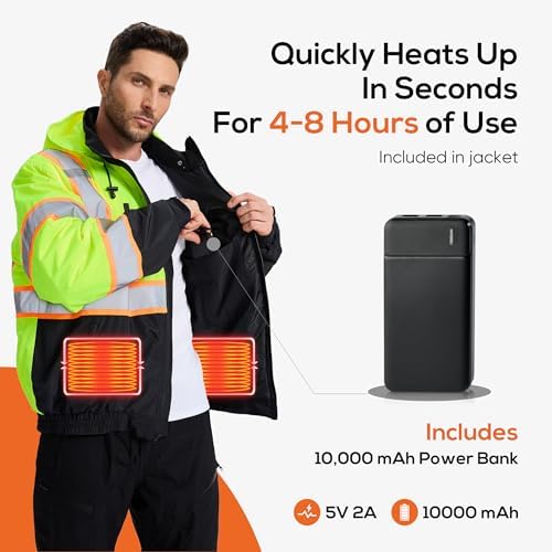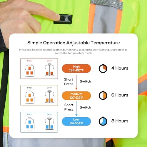 3 Adjustable heating Settings:SRsafety reflective heated jacket can adjust the temperature to your liking From 96 ℉ to 157℉,In addition, SRsafety safety heated jacket is made of durable, waterproof and windproof materials that ensure long-lasting comfort even in challenging conditions.