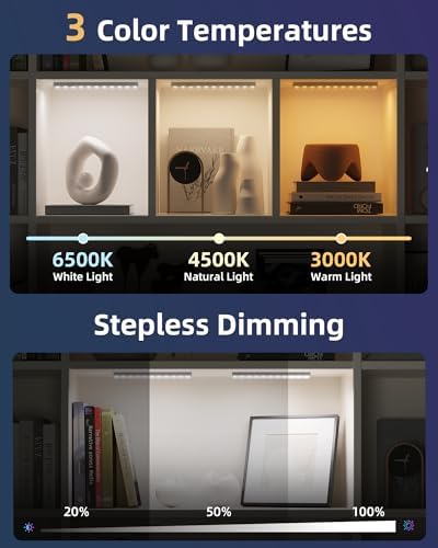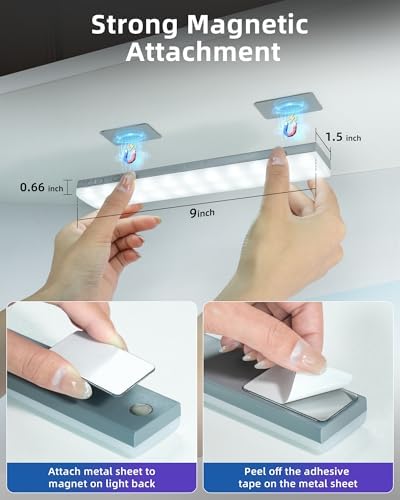 Easy Setup & Wide Application: Wireless cabinet light, hassle-free to install. Built-in strong magnets for direct metal attachment; adhesive metal plate included for non-metal surfaces. Easy removal for charging/repositioning. Suitable for kitchens, living room, cabinets, wine cabinet, bar nock, showcase, wine rack, bars, gaming room and other spaces